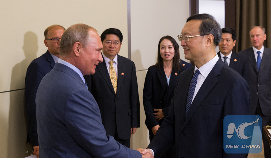 Russian President Vladimir Putin shakes hands with Yang Jiechi, a member of the Political Bureau of the Communist Party of China (CPC) Central Committee, in Sochi, Russia, on August 15, 2018. (Xinhua/Bai Xueqi)