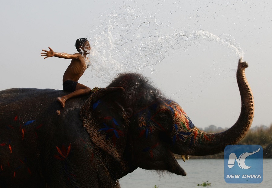 A boy enjoys elephant bathing during the 15th Elephant Festival in Sauraha, a tourism hub in southwest Nepal's Chitwan district on Dec. 27, 2018. (Xinhua/Sunil Sharma)