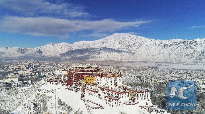 Aerial photo shows the snow-covered Potala Palace in Lhasa, capital of southwest China's Tibet Autonomous Region, Dec. 19, 2018. (Xinhua/Purbu Zhaxi)
