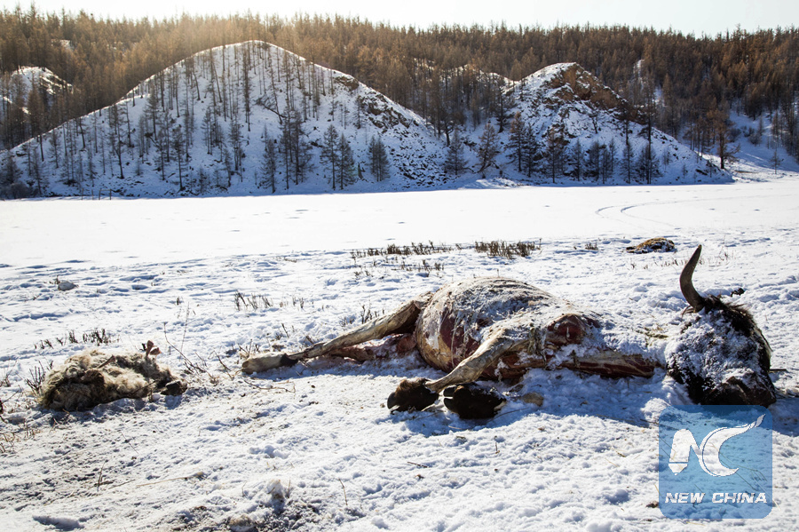 In this Feb. 13, 2017 photo dead animals lie in the snow in a rural area of Khuvsgul province in northern Mongolia.