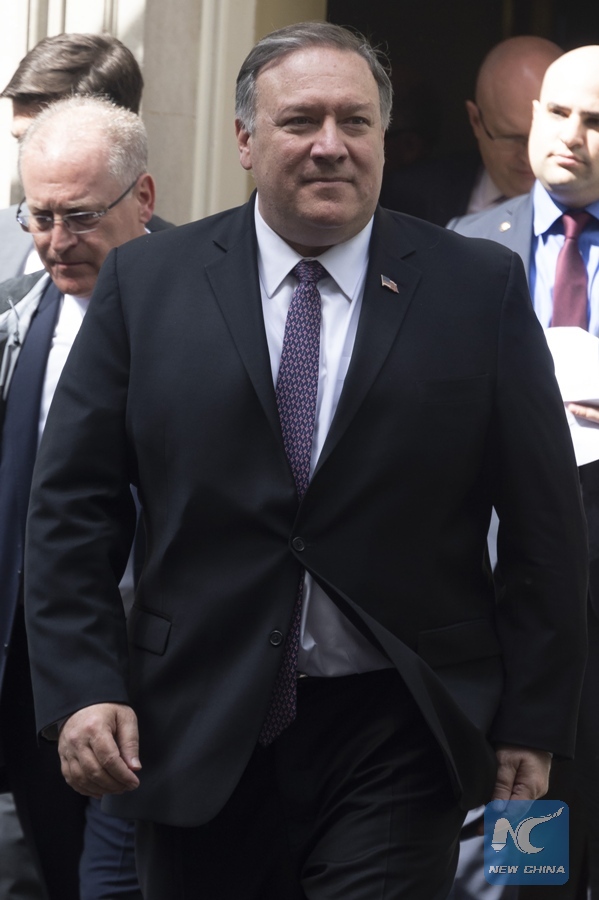 U.S. Secretary of State Mike Pompeo (Front) leaves after a meeting with British Prime Minister Theresa May at Downing Street in London, Britain, on May 8, 2019. U.S. Secretary of State Mike Pompeo is in London on Wednesday for talks with British officials on the special relationship between the two countries amid heightened tensions with Iran and Brexit uncertainty. (Xinhua/Ray Tang)