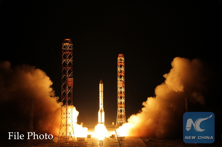 A Proton-M carrier rocket blasts off from the launchpad at the Baikonur cosmodrome in southern Kazakhstan on May 31, 2019. (ROSCOSMOS PHOTO)