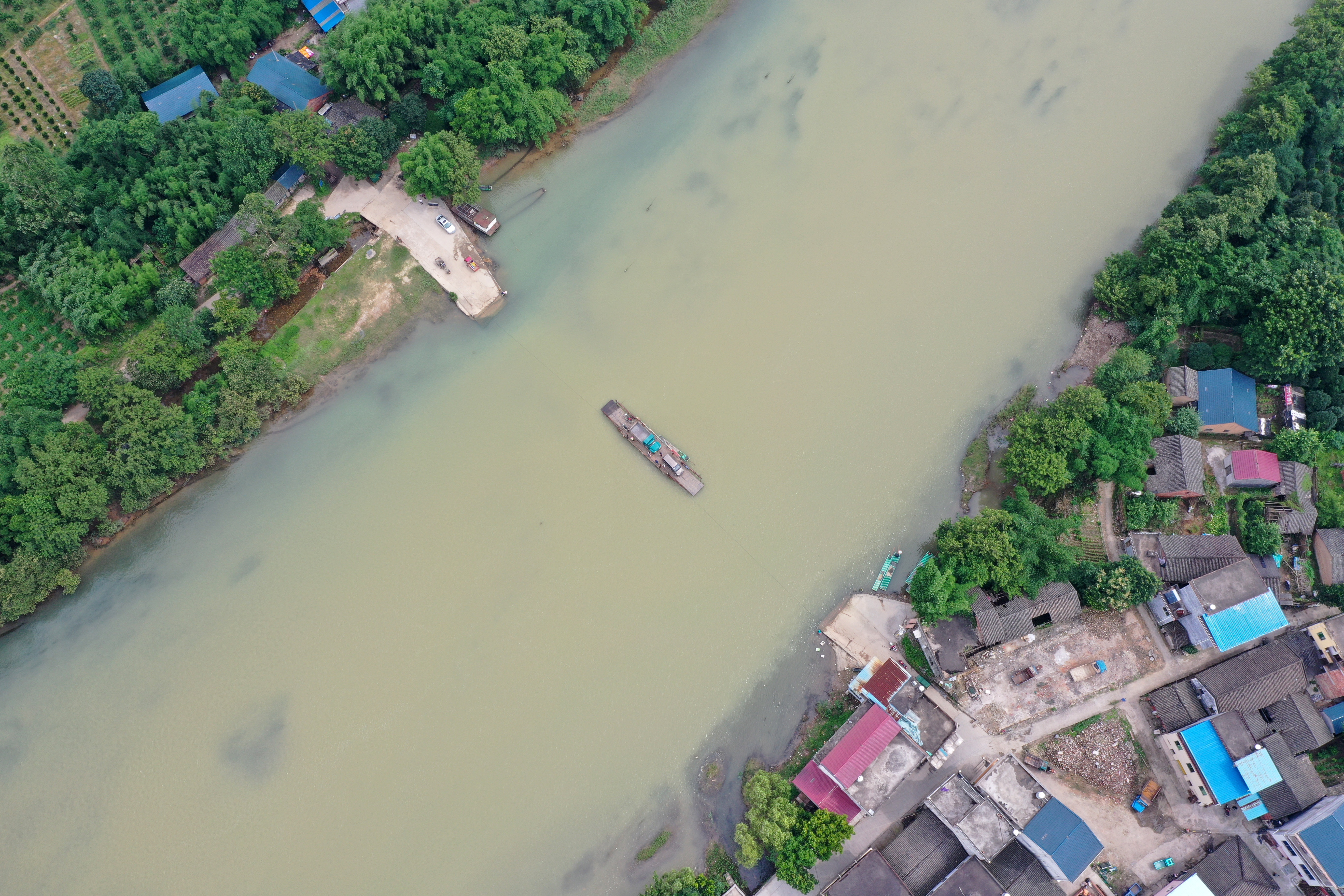 Aerial photo taken on June 29, 2019 shows the Fenghuangzui ferry in Fenghuang Town, Quanzhou County of south China's Guangxi Zhuang Autonomous Region. (Xinhua/Lu Boan)