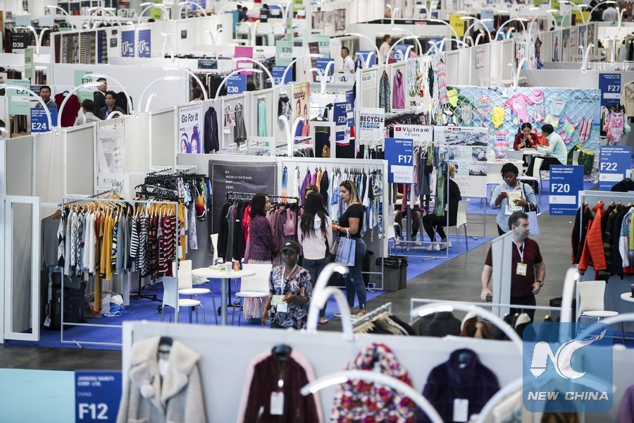 People visit the 20th China Textile and Apparel Trade Show in New York, the United States, July 22, 2019. The fair serves as a platform to showcase the latest industrial trends and help Chinese companies explore the U.S. market. (Xinhua/Wang Ying)