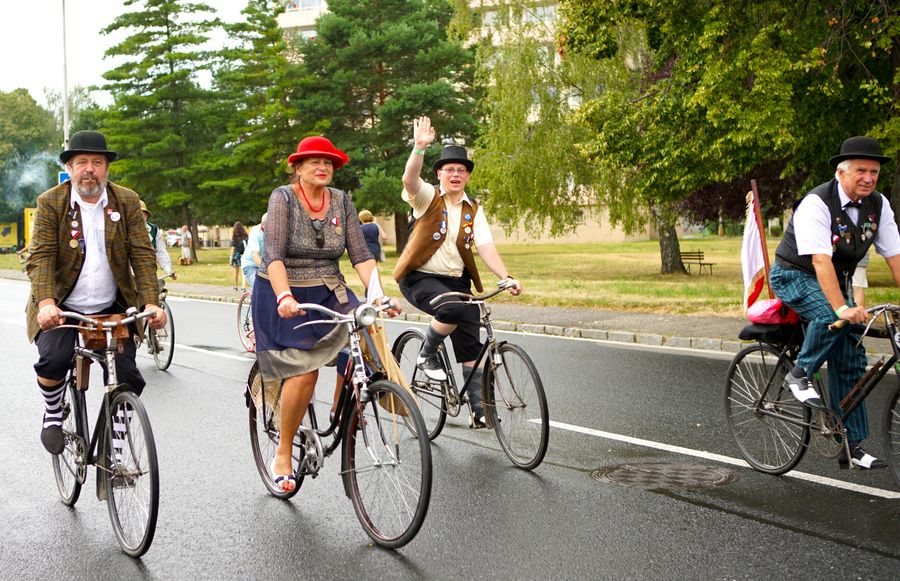 The bicycle ride was organized by the Czech Velocipedists Club. It began at the Tyl Theater, preceded with biking performance with music. The line-up was performed by riders on high wheels.