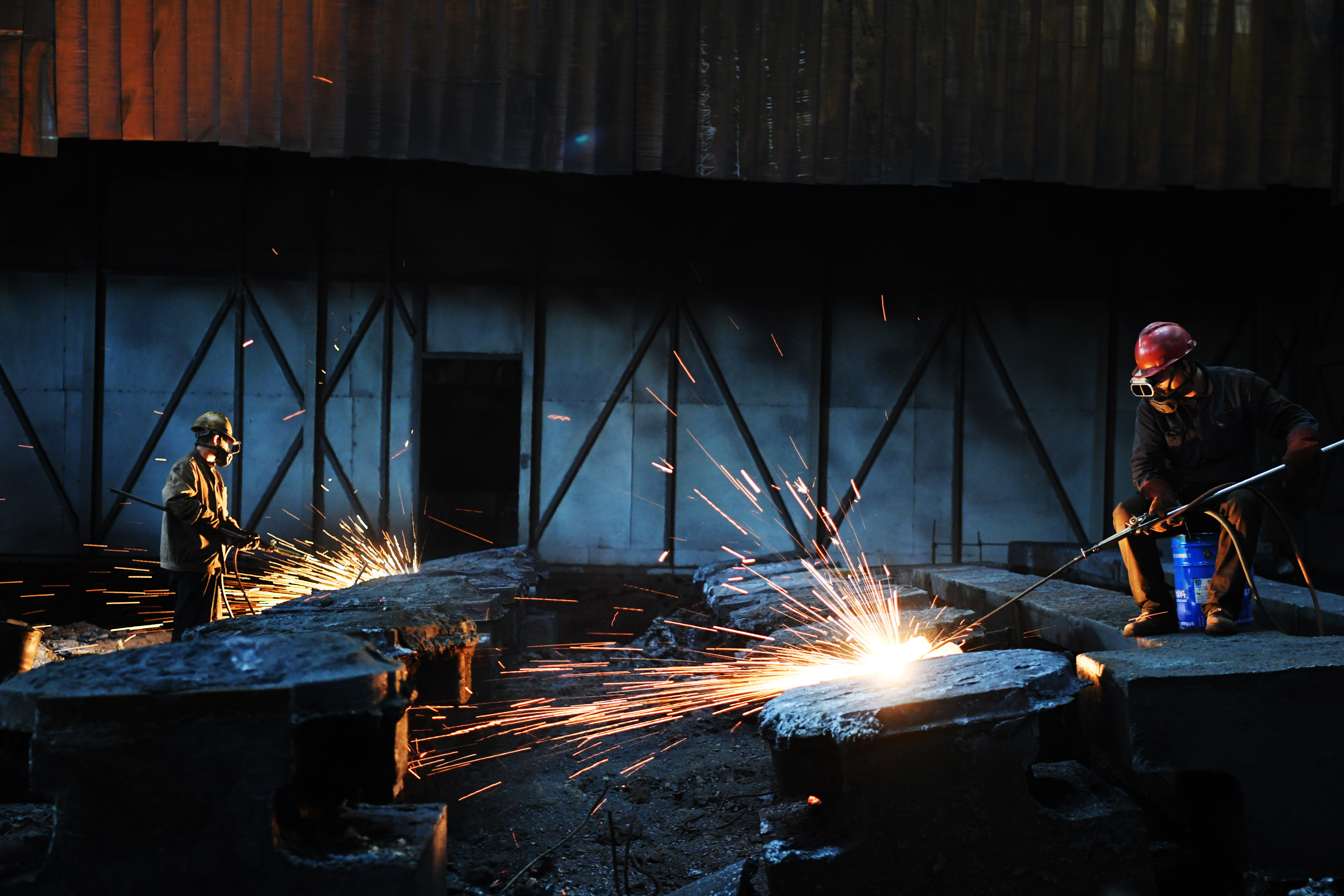 Workers weld components at a factory of Harbin Electric Machinery Company Limited in Harbin, Sept. 2, 2019. (Xinhua/Wang Jianwei)