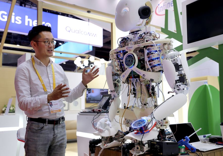 An exhibitor presents a robot on display for the second China International Import Expo (CIIE) at the National Exhibition and Convention Center in Shanghai, east China, Nov. 3, 2019. The second edition of CIIE will run from Nov. 5 to 10 in Shanghai. (Xinhua/Liu Ying)
