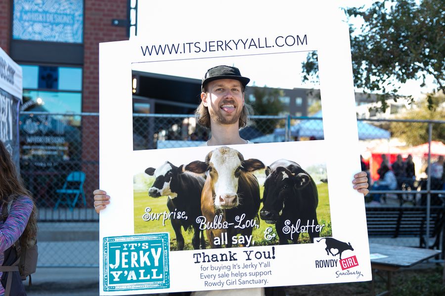 A man holds a banner to promote a plant-based jerky at Texas Veggie Fair in Dallas, Texas, the United States, Nov. 2, 2019. (Photo by Dan Tian/Xinhua)■