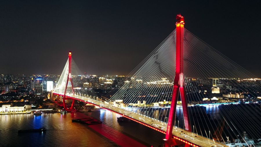 Aerial photo taken on Sept. 18, 2019 shows the night view of the Huangpu River in Shanghai, east China. (Xinhua/Ren Long)