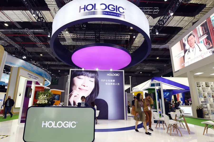 Visitors walk past the booth of HOLOGIC, Inc. during the second China International Import Expo (CIIE) in Shanghai, east China. (Xinhua/Fan Peishen)