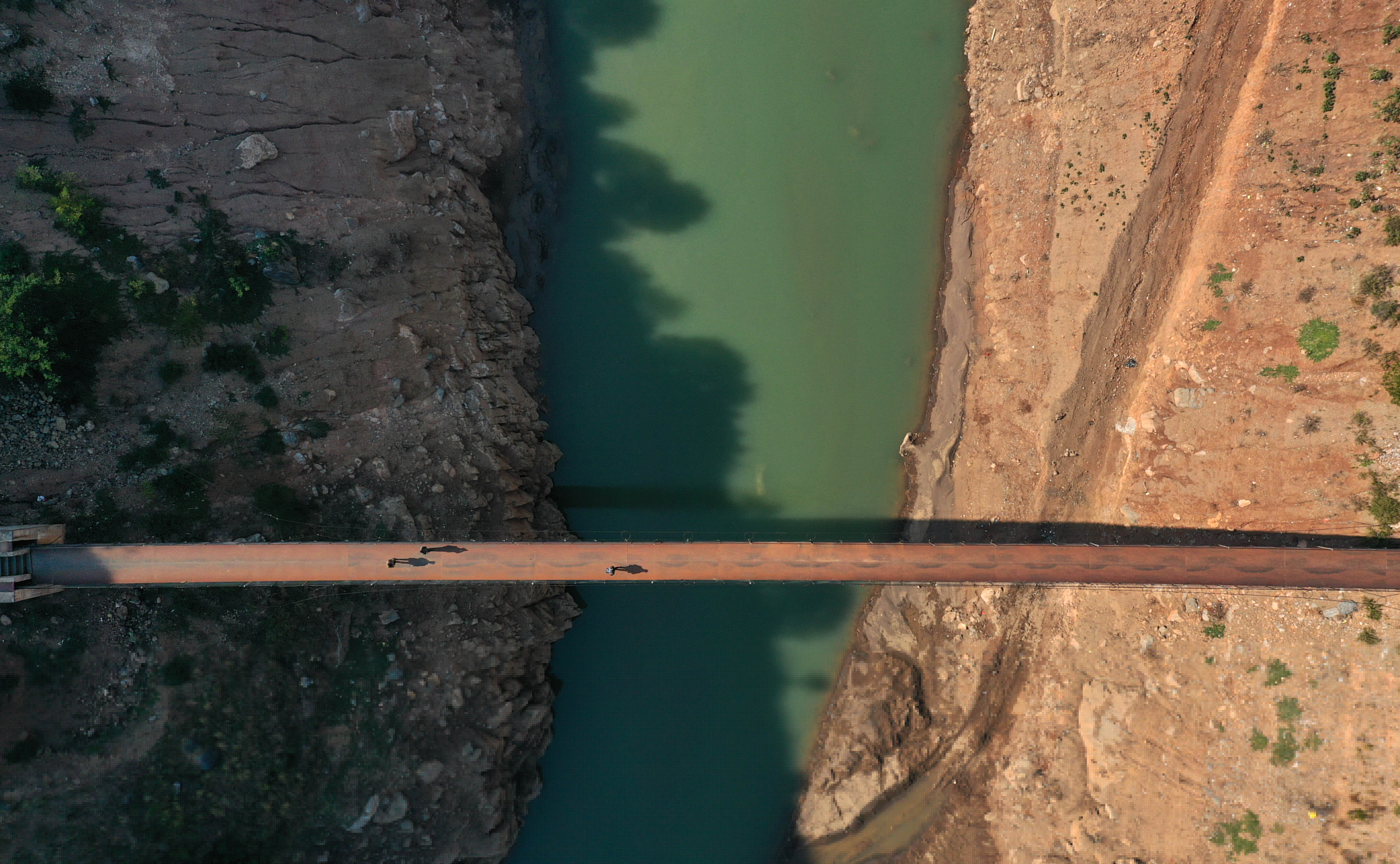 Aerial photo taken on Dec. 12, 2019 shows people walking on a bridge spanning the Niulan River in southwest China. (Xinhua/Yang Wenbin)
