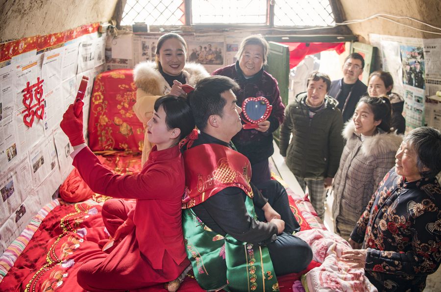 Photo taken on Dec. 18, 2019 shows a traditional wedding ceremony performance in Zhidan County of Yan'an City, northwest China's Shaanxi Province. The traditional wedding customs in Zhidan County, a city-level intangible cultural heritage, has been preserved and passed on through various approaches. Except for archives recorded, traditional wedding ceremony performance is one of the most popular activities to get people close to the customs. (Xinhua/Tao Ming)