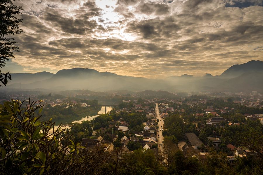 Photo taken on Jan. 1, 2020 shows the sunset scenery of Luang Prabang on the riverside of Mekong River, Laos.(Xinhua/Kaikeo Saiyasane)