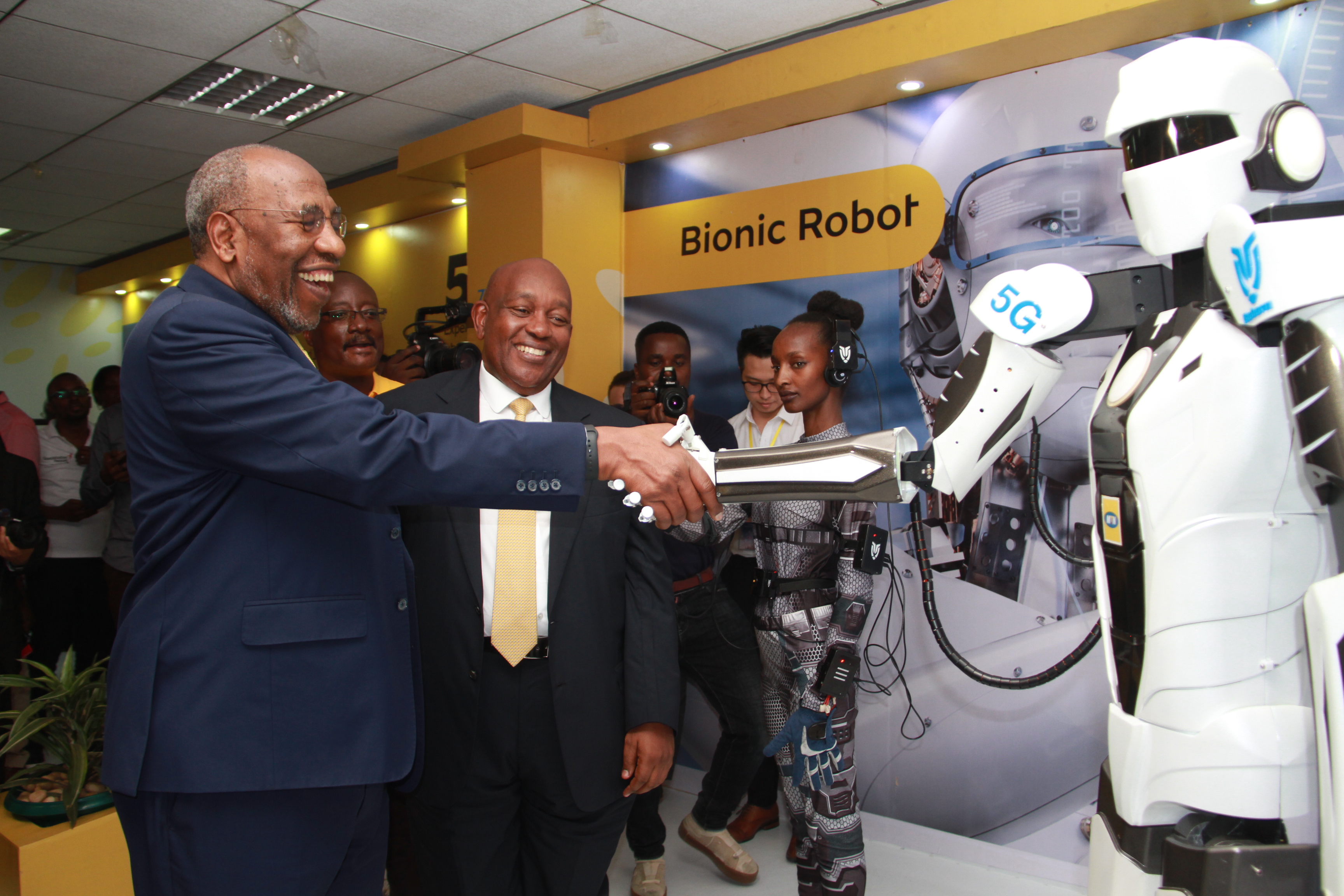 Uganda's Prime Minister Ruhakana Rugunda(L) shakes hands with a robot that uses the 5G network during the 5G technology trial ceremony in Kampala, Capital of Uganda, Jan. 17, 2020. (Xinhua/Zhang Gaiping)