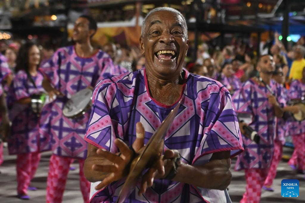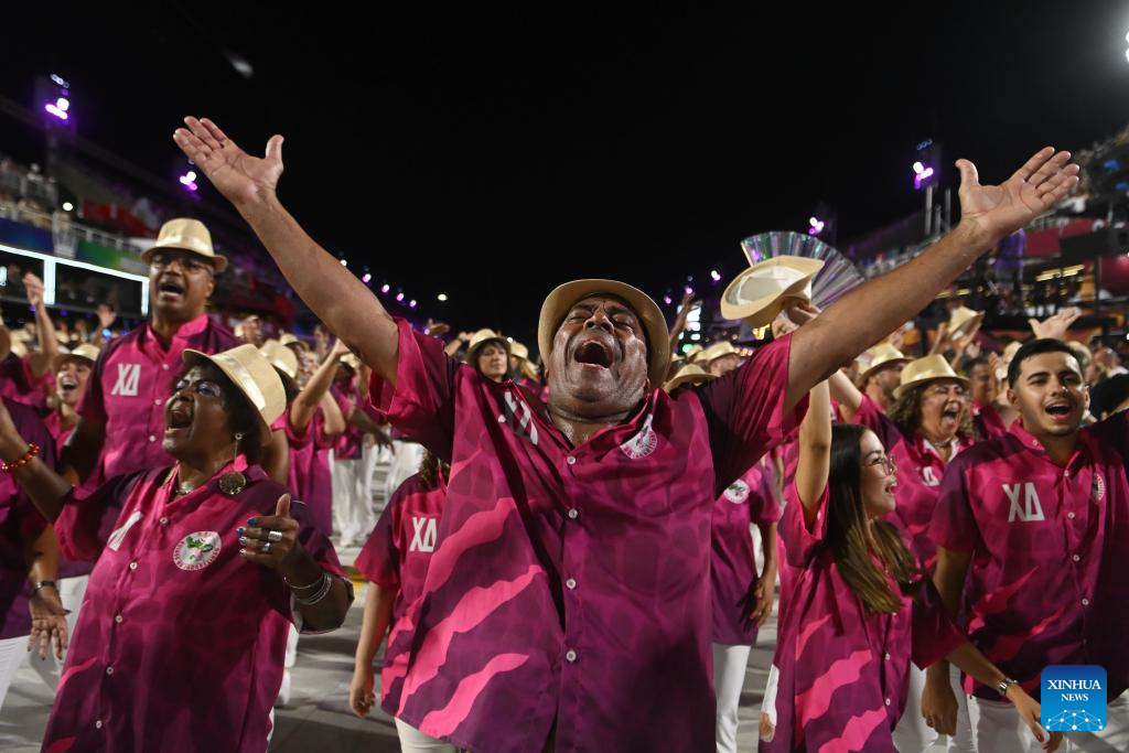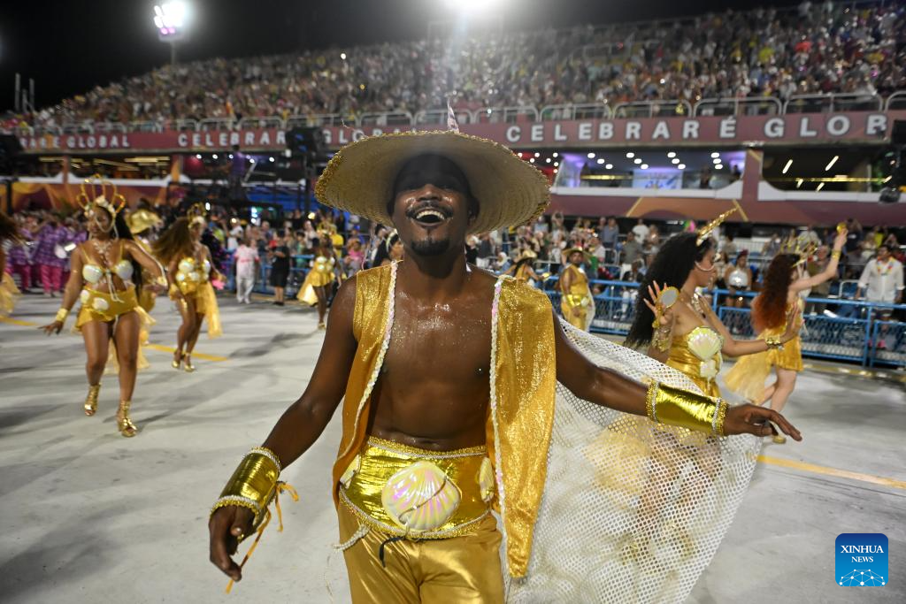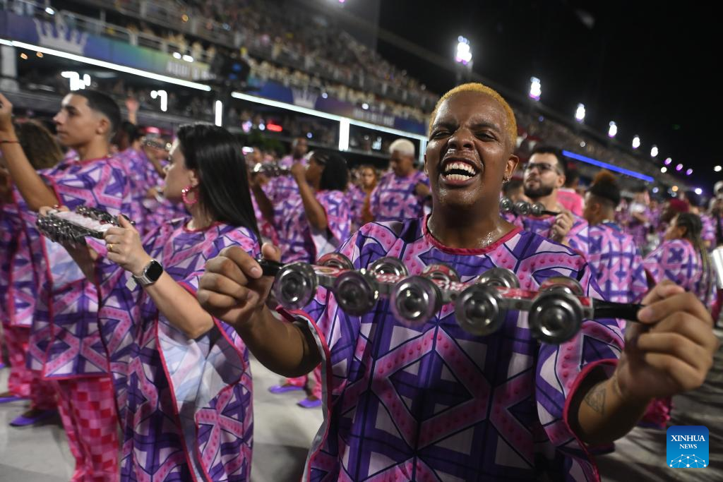 Revellers attend a parade during the Carnival 2026 on the Marques De Sapucai Avenue in Rio de Janeiro, Brazil, Feb. 13, 2026. (Photo by Lucio Tavora/Xinhua)