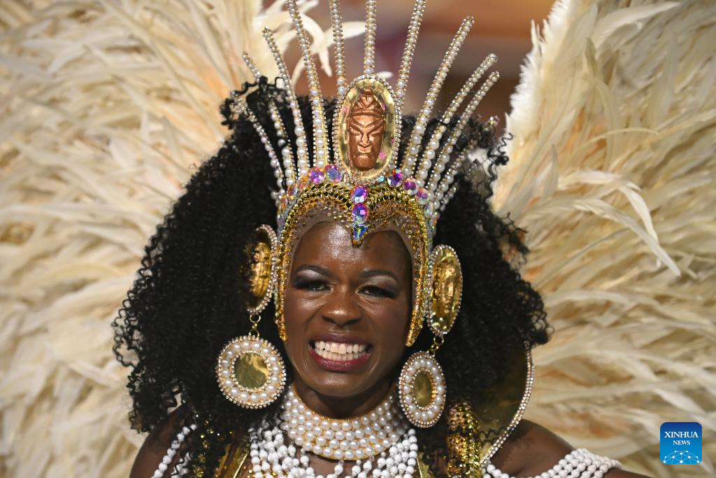 A reveller attends a parade during the Carnival 2026 on the Marques De Sapucai Avenue in Rio de Janeiro, Brazil, Feb. 13, 2026. (Photo by Lucio Tavora/Xinhua)