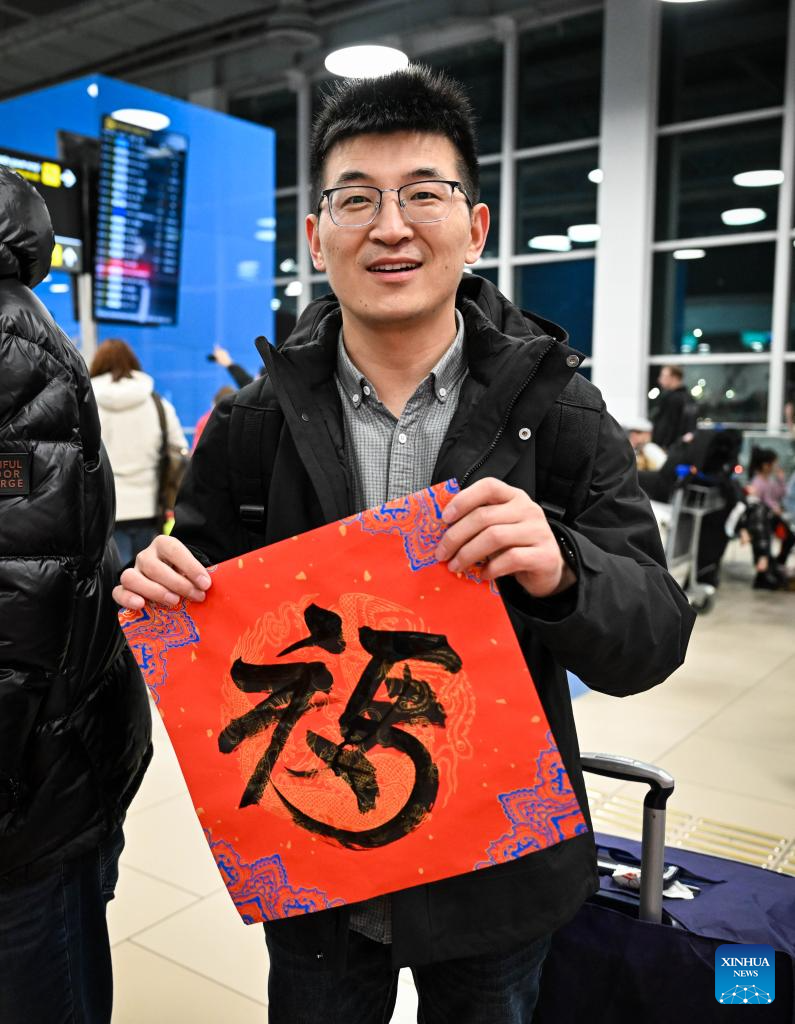 Passengers take part in a Chinese New Year cultural event at the Almaty International Airport in Almaty, Kazakhstan, Feb. 13, 2026. (Xinhua/Li Renzi)