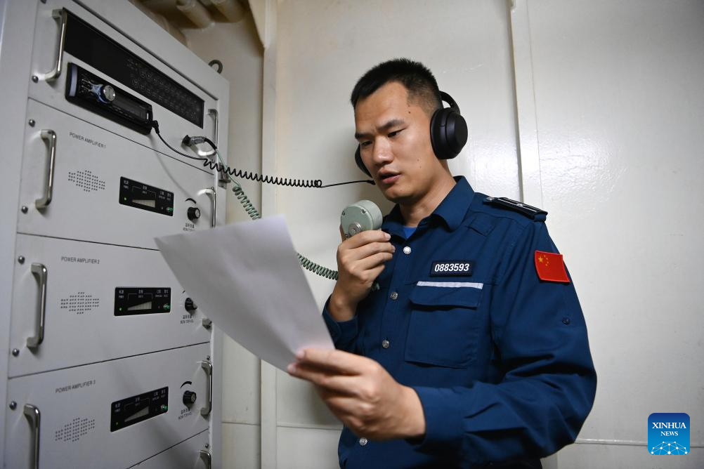 Law enforcer Chen Chen performs the daily broadcast aboard the China Coast Guard (CCG) vessel Wanshan in the territorial waters of China's Huangyan Dao, Feb. 10, 2026. Right ahead of the Chinese New Year, a traditional occasion for family reunion in China, a group of young law enforcers remain loyally stationed and highly alert around the clock, hundreds of miles away from their loved ones. (Photo by Zhai Yifan/Xinhua)