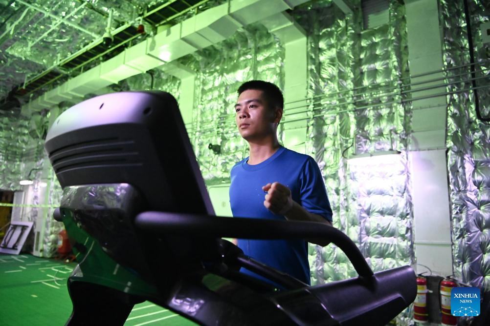 Law enforcer Wang Hong exercises during his break time aboard the China Coast Guard (CCG) vessel Wanshan in the territorial waters of China's Huangyan Dao, Feb. 11, 2026. Right ahead of the Chinese New Year, a traditional occasion for family reunion in China, a group of young law enforcers remain loyally stationed and highly alert around the clock, hundreds of miles away from their loved ones. (Photo by Zhai Yifan/Xinhua)