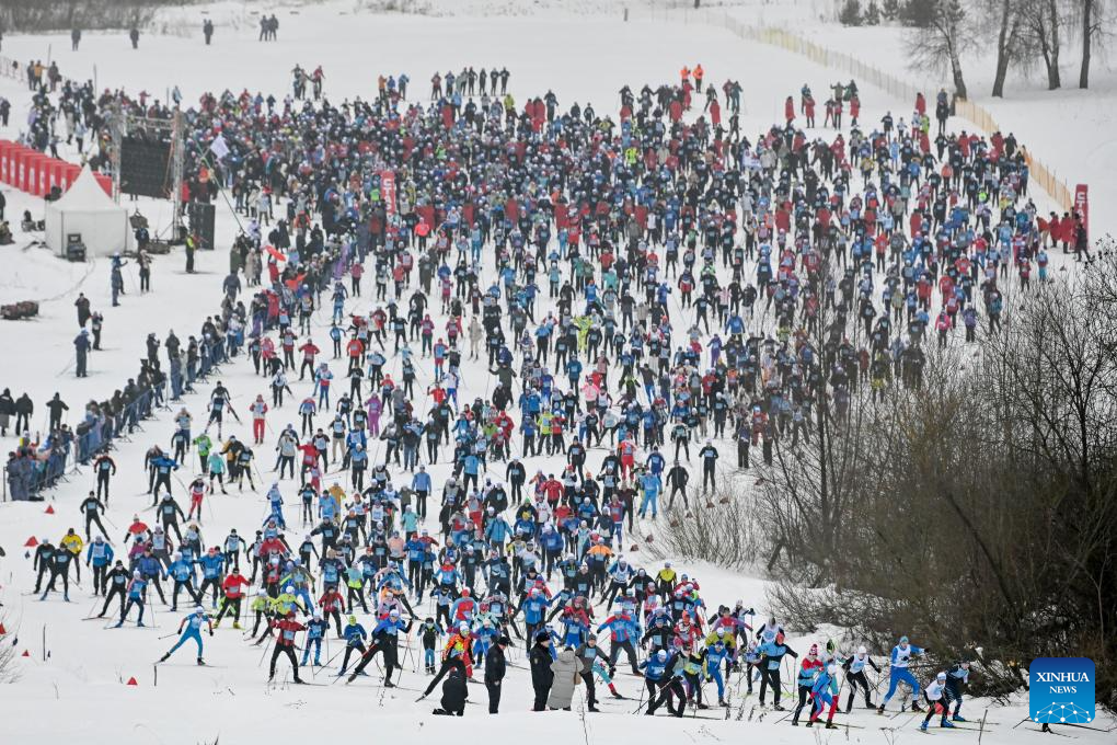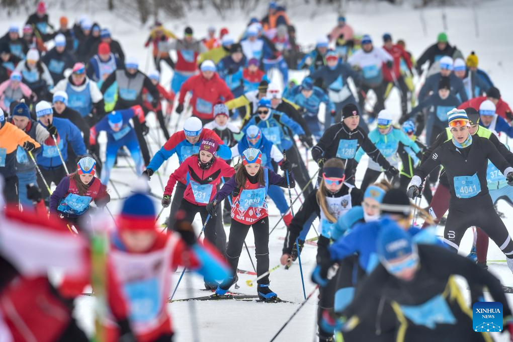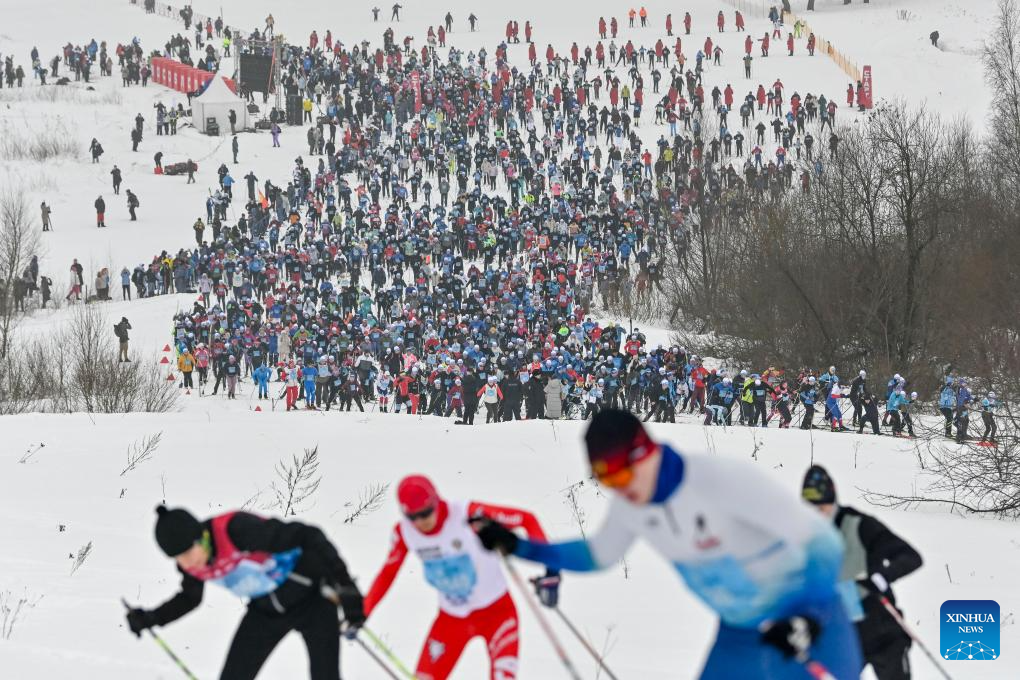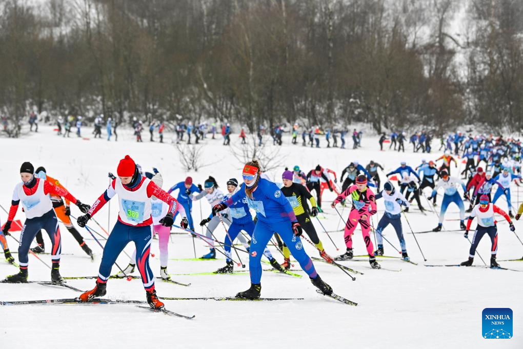 People take part in a mass skiing competition at the 2026 Ski Track of Russia in Khimki, Russia, Feb. 14, 2026. (Photo by Alexander Zemlianichenko Jr/Xinhua)