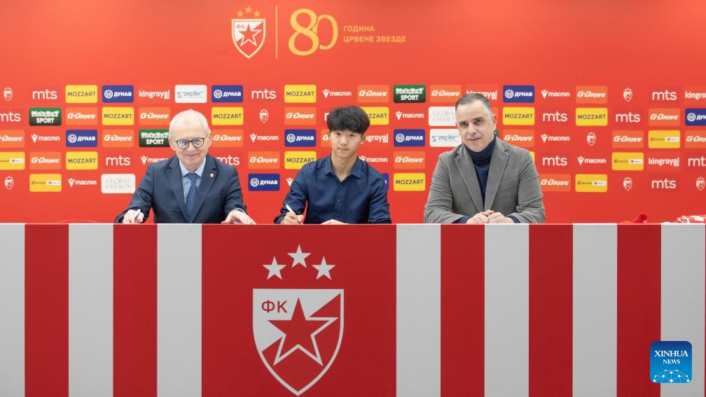 Red Star Belgrade Football Club president Svetozar Mijailovic (L), Chinese player Wan Xiang (C), and the club's academy director Nikola Jelic attend the signing ceremony in Belgrade, Serbia, Feb. 14, 2026. (Photo by Wang Wei/Xinhua)