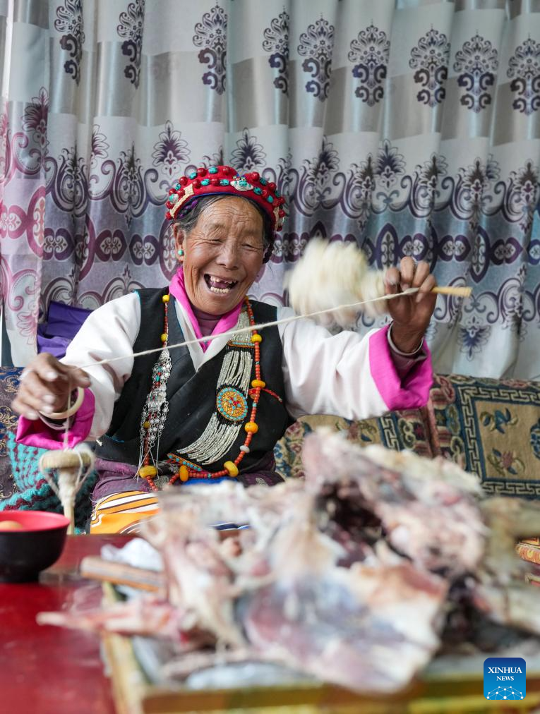 Pudron spins wool threads at home in Lumpa village of Xigaze City, southwest China's Xizang Autonomous Region, March 12, 2026. Pudron, 86, lives in Lumpa village of Xigaze City. She can never forget the old days when life was full of hardship but dignity. Since childhood, Pudron was under strict control of serf owners. Living in a low adobe house with only a small window hole, her whole family slept on the floor with only a shabby sheepskin as the quilt. Pudron had to get up before dawn to serve various duties, like driving donkeys to carry goods and fertilizing the farmland. Besides, she had to twist wool and do weaving. Thick calluses formed on her hands... Throughout the year, she had no resting day even she was hurt. Life was unendurable for her and her family, but they had no choices but lived for tiny little earnings. It was not until the democratic reform in Xizang in 1959, when millions of serfs were emancipated, that her life truly began to change for the better. Nowadays, Pudron lives with her son and daughter-in-law in a spacious and warm two-story Tibetan-style house. She is even not used to having so much butter in daily life. This is a "sweet trouble" that I never dreamed of before, she said. (Xinhua/Jigme Dorje)