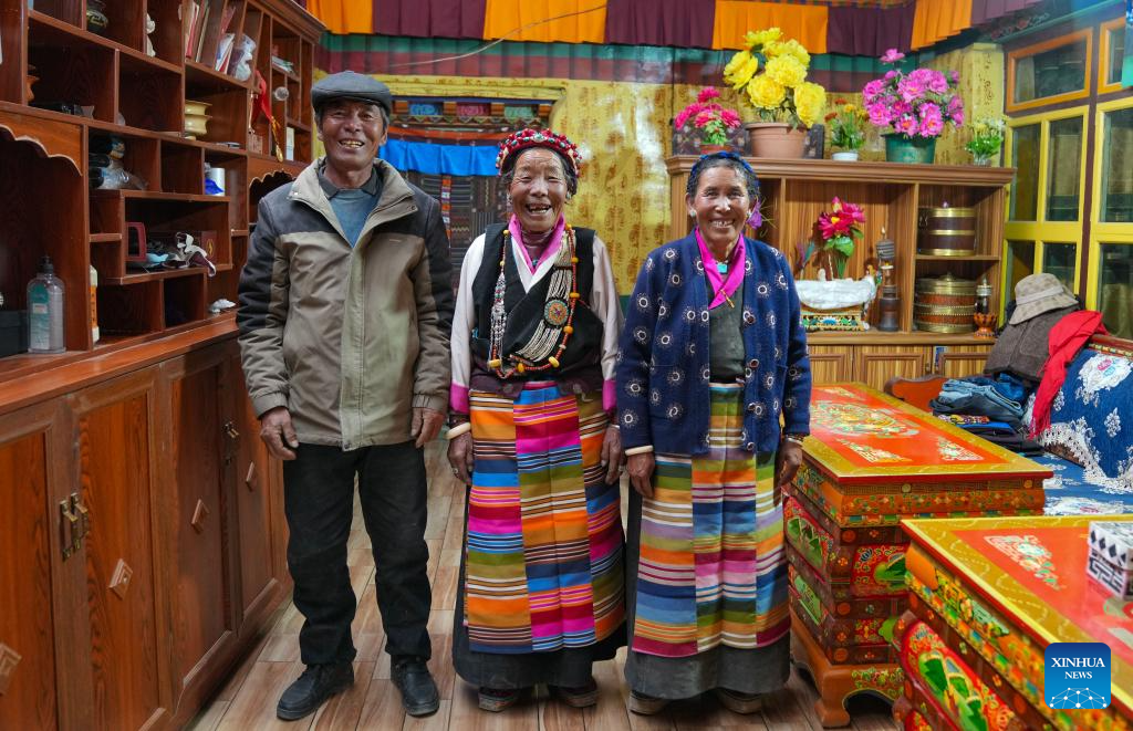 LHASA, March 28 (Xinhua) -- Pudron, in her eighties, sits on a thick Tibetan sofa in her sunlit home, dressed in vibrant traditional attire, with a silver necklace gleaming around her neck.