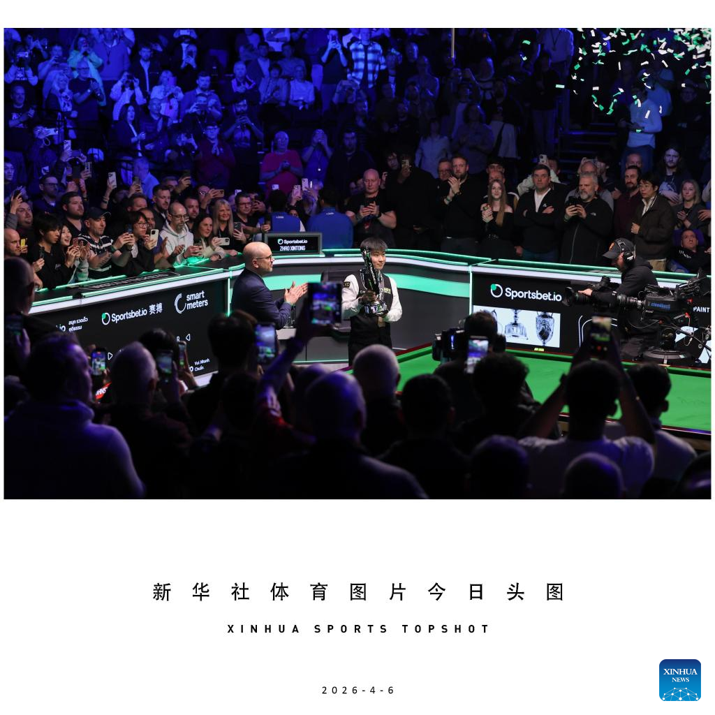 Zhao Xintong (C) of China celebrates with his trophy during the awarding ceremony after the final between Zhao Xintong of China and Judd Trump of England at the 2026 Snooker Tour Championship in Manchester, Britain, April 5, 2026. (Photo by Zhai Zheng/Xinhua)