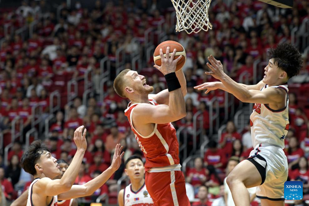 Jordy Tshimanga (R) of XAC Broncos shoots during the 2026 Basketball Champions League Asia-East group phase group B match between South China Athletic and XAC Broncos in Hong Kong, south China, April 6, 2026. (Xinhua/Lo Ping Fai)