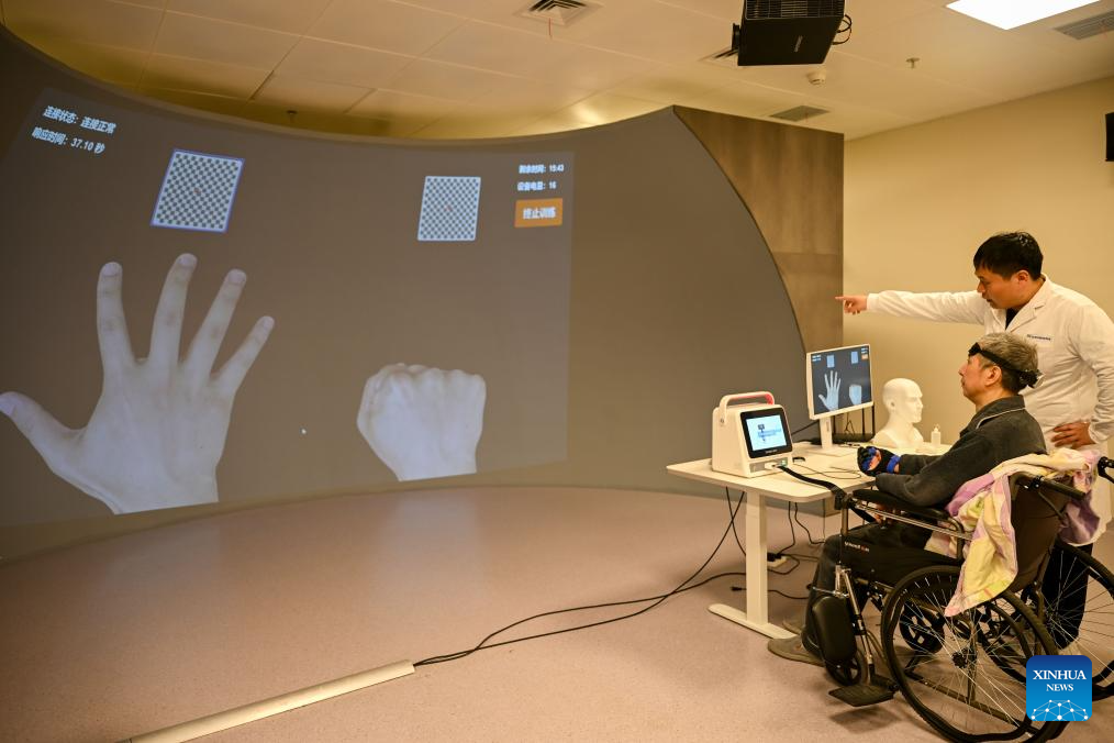 A doctor guides a patient to conduct brain-computer interface rehabilitation training at a hospital in Guiyang, southwest China's Guizhou Province, April 7, 2026. The World Health Day is observed annually on April 7, which marks the anniversary of the WHO's founding and raises awareness of pressing global health issues. (Photo by Yuan Fuhong/Xinhua)
