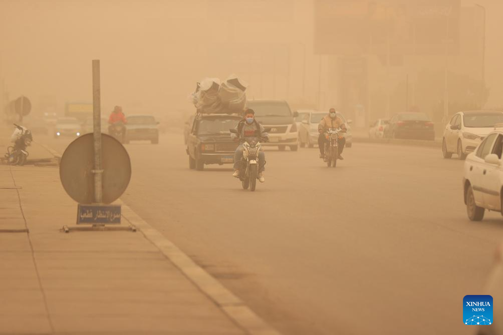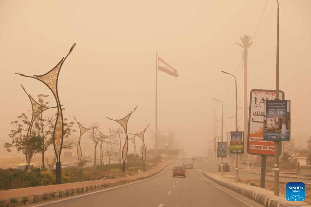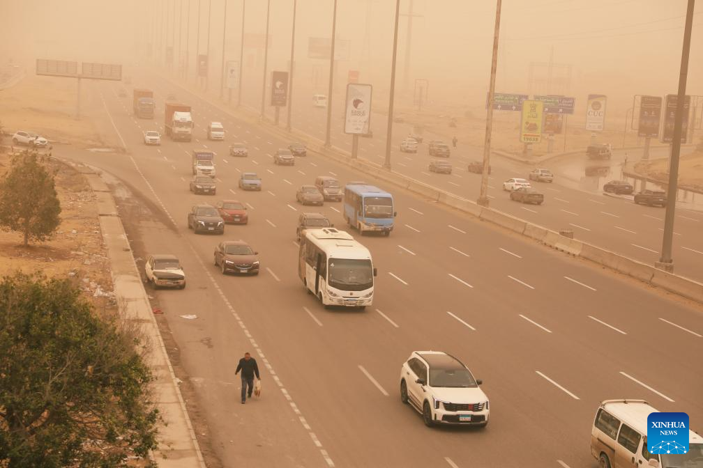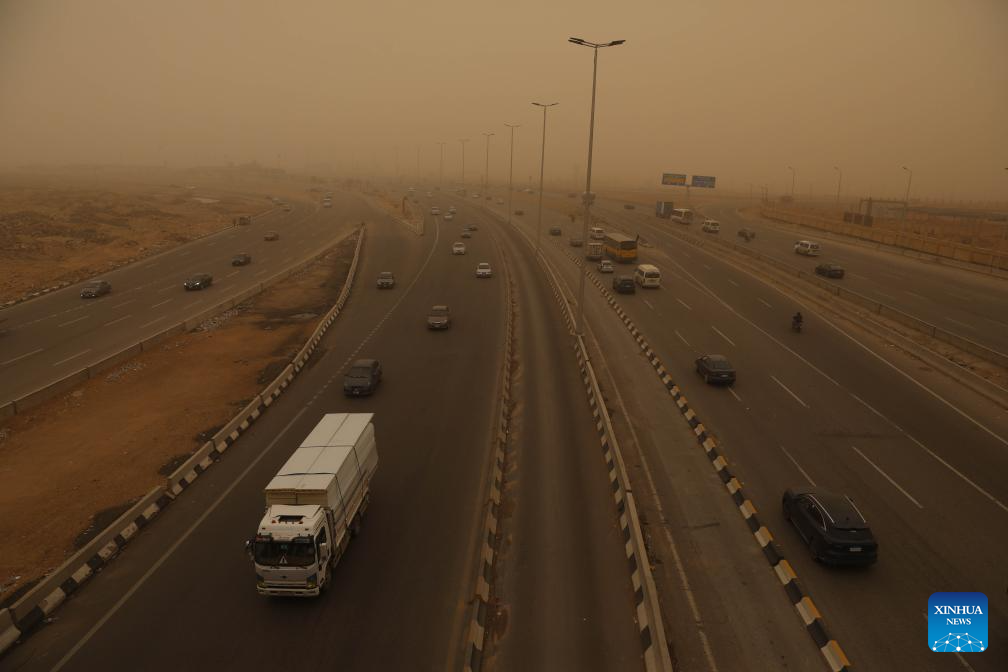 Vehicles are seen on a road amid a dust storm in Cairo, Egypt, April 2, 2026. (Xinhua/Ahmed Gomaa)