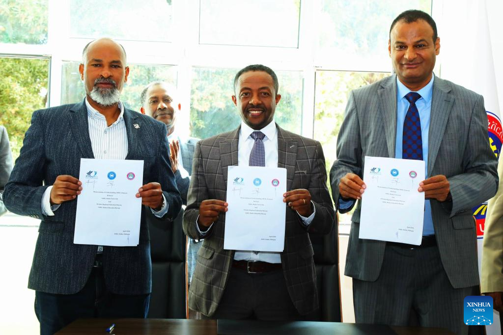This photo taken on April 3, 2026 shows the signing ceremony of a memorandum of understanding between Addis Ababa University and the Addis Ababa and Oromia education bureaus in Addis Ababa, capital of Ethiopia. (Addis Ababa University/Handout via Xinhua)