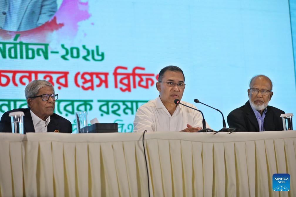 Chairman of the Bangladesh Nationalist Party (BNP) Tarique Rahman speaks at a news briefing in Dhaka, Bangladesh, Feb. 14, 2026. Tarique Rahman said on Saturday that China has long been regarded as an important development partner of Bangladesh and expressed hope that the two countries will continue to work together for common development. (Photo by Habibur Rahman/Xinhua)