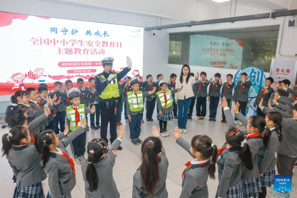 A traffic police guides pupils in doing gesture exercises of traffic safety at a primary school in Wuhan City, central China's Hubei Province, March 30, 2026. March 30 marks China's national safety education day for middle and primary school students. (Photo by Zhao Jun/Xinhua)