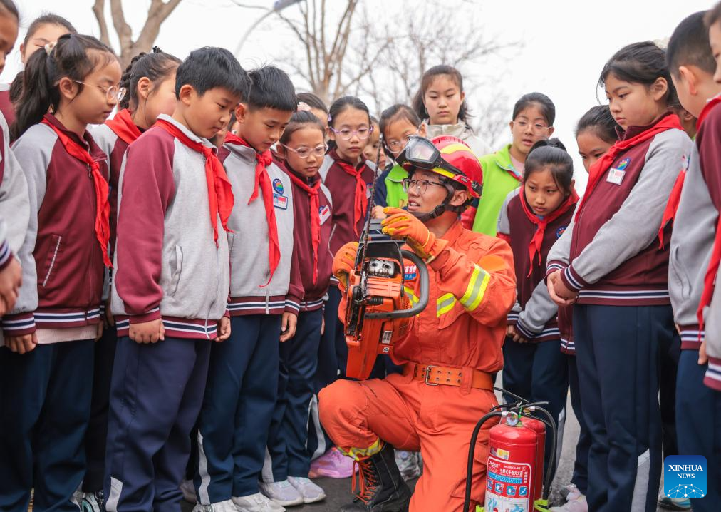 Pupils are introduced with the knowledge of using fire extinguisher at a primary school in Qinghua Town, Jiaozuo City of central China's Henan Province, March 30, 2026. March 30 marks China's national safety education day for middle and primary school students. (Photo by Cheng Quan/Xinhua)