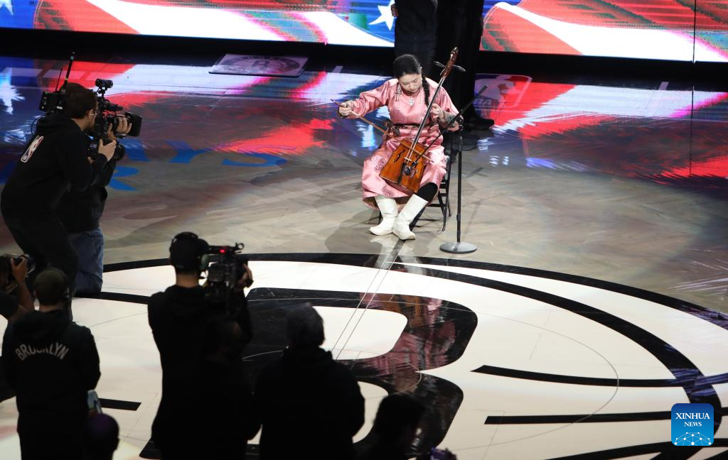 A musician performs Matouqin, a Chinese traditional instrument, at Barclays Center in New York, the United States, Feb. 11, 2026. (Xinhua/Zhang Fengguo)