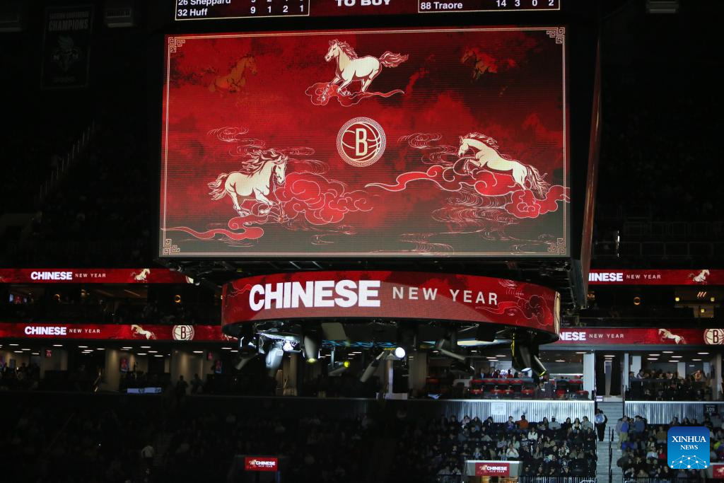 Screens show Chinese New Year words with galloping horses design at Barclays Center in New York, the United States, Feb. 11, 2026. (Xinhua/Zhang Fengguo)