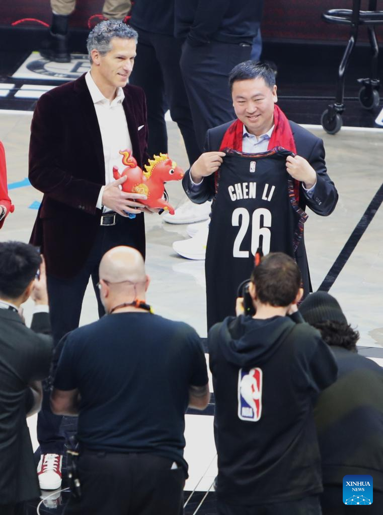 Chinese Consul General in New York Chen Li (R) exchanges gifts with a representative from Brooklyn Nets at Barclays Center in New York, the United States, Feb. 11, 2026. (Xinhua/Zhang Fengguo)