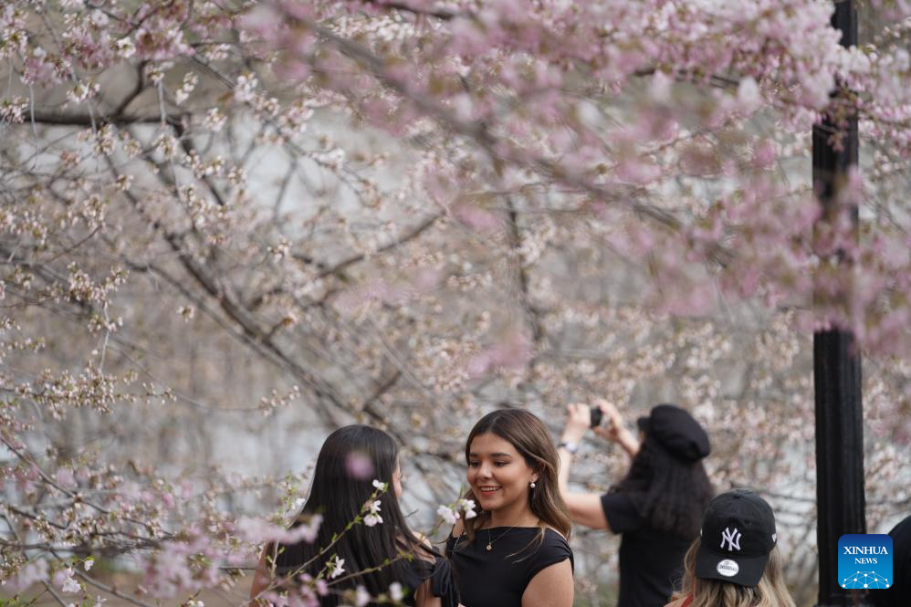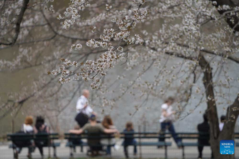People watch cherry blossoms at the Central Park in New York, the United States, on April 1, 2026. (Xinhua/Zhang Fengguo)