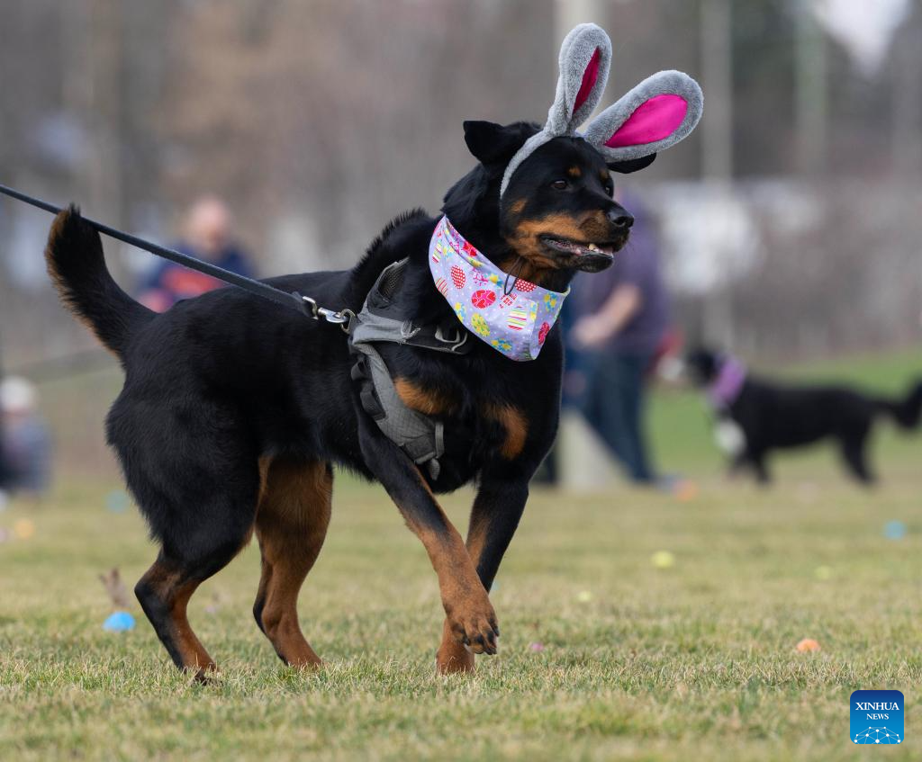 A pet dog collects eggs during the 2026 Easter Egg Hunt for Dogs in Hamilton, Ontario, Canada, on April 3, 2026. About 300 participants and their pet dogs took part in this annual traditional event here on Friday to celebrate Easter. (Photo by Zou Zheng/Xinhua)