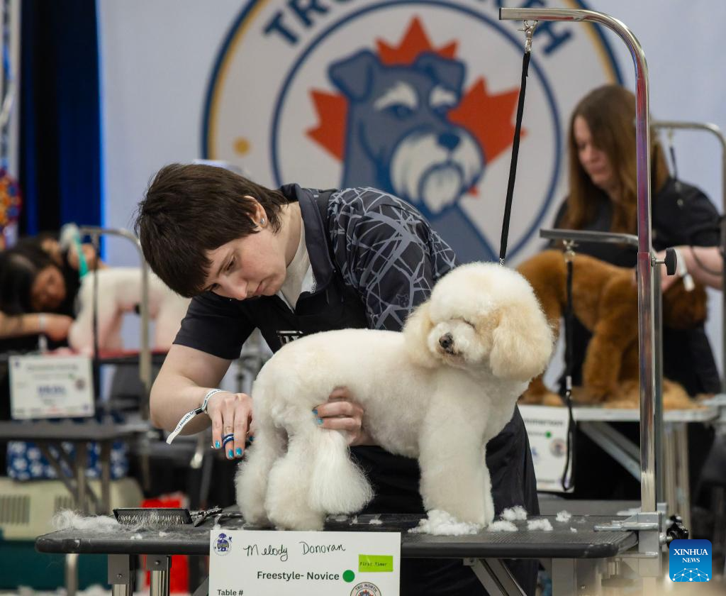 Pet groomers attend a grooming show at the 2026 Spring Canadian Pet Expo in Mississauga, Ontario, Canada, on April 3, 2026. Featuring a pet marketplace, pet competitions and more, this three-day event kicked off here on Friday and will last until Sunday. (Photo by Zou Zheng/Xinhua)