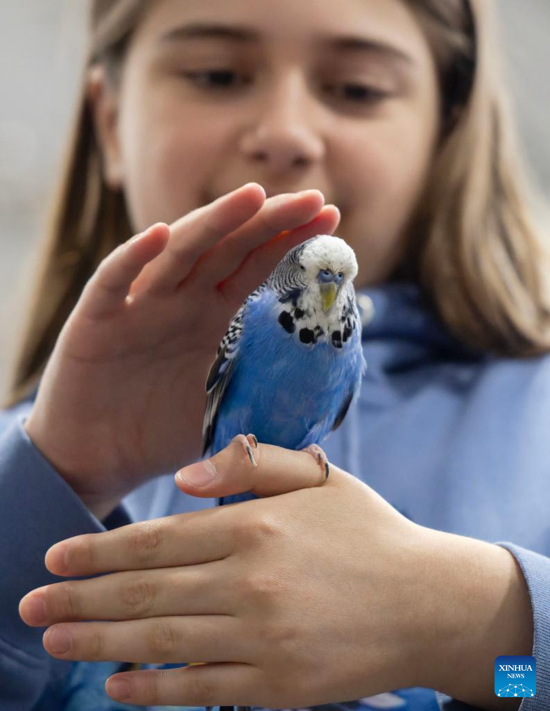 A girl pets a budgerigar at the 2026 Spring Canadian Pet Expo in Mississauga, Ontario, Canada, on April 3, 2026. Featuring a pet marketplace, pet competitions and more, this three-day event kicked off here on Friday and will last until Sunday. (Photo by Zou Zheng/Xinhua)