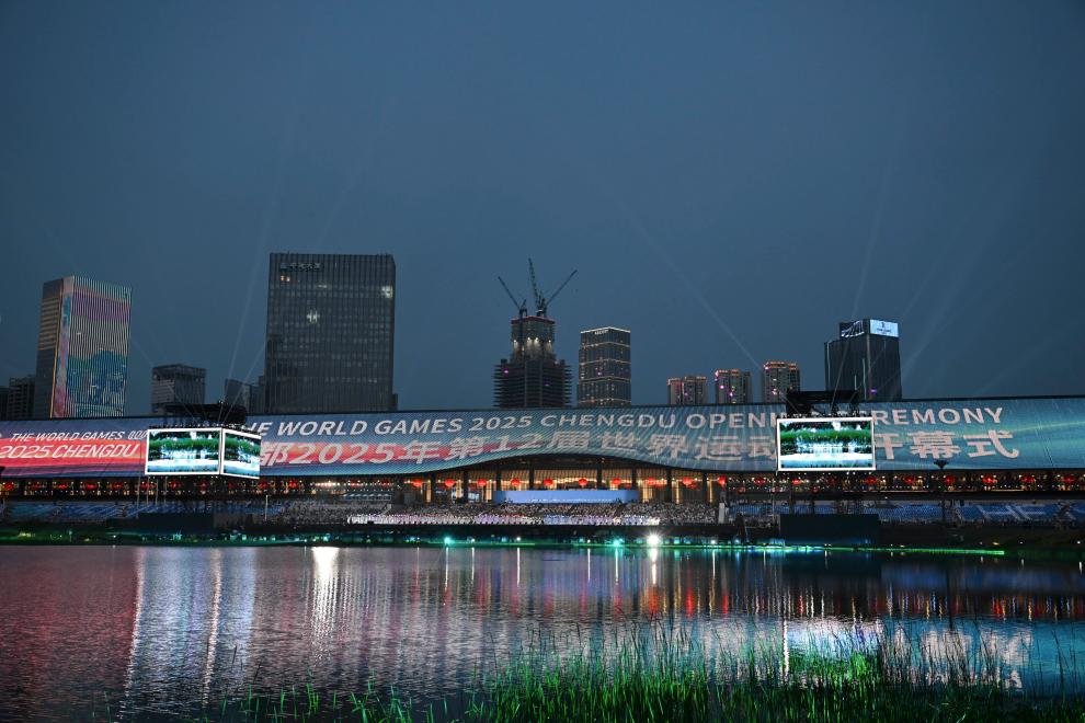 热情在空气中铺展。主舞台正后方的湖面上,两道水柱腾空而起,瞬间构成一座高耸的迎宾水门。在吉祥物“蜀宝”“锦仔”的引导下,来自116个国家和地区的运动员、随队官员、技术官员缓缓踏上“荣耀之路”。