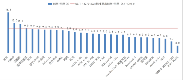 在合规性检测中,Dickies品牌的样品未标注绒子含量,其他样品使用说明信息完整;在安全性检测中,所有样品纤维含量、甲醛含量、pH值均表现良好;在羽绒服品质检测中,有3款样品(品牌为贝肽斯、PUMA®和雅鹿)绒子含量、绒丝+羽丝的检测结果未能达到国家推荐性标准所明示的要求。