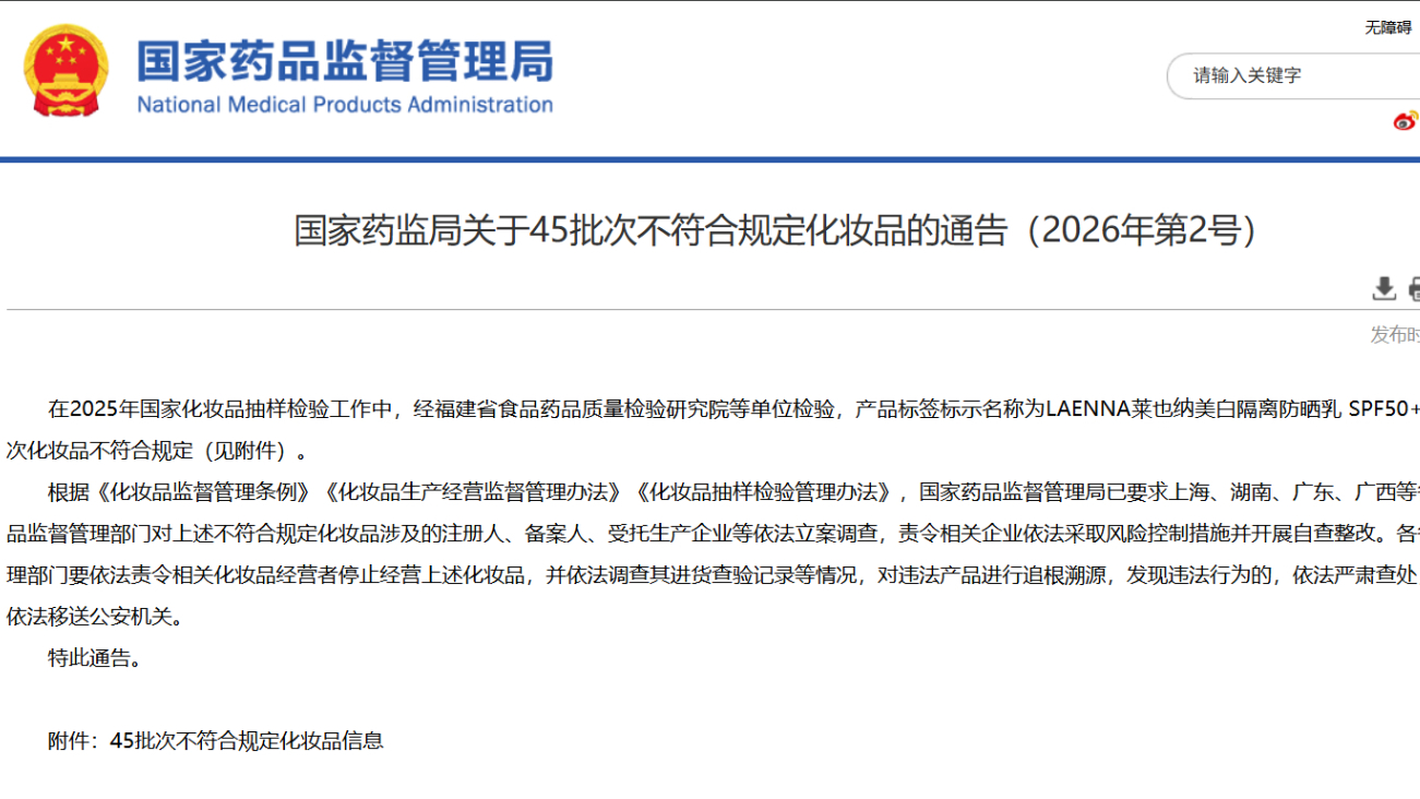 國(guó)家藥監(jiān)局關(guān)于45批次不符合規(guī)定化妝品的通告(2026年第2號(hào))