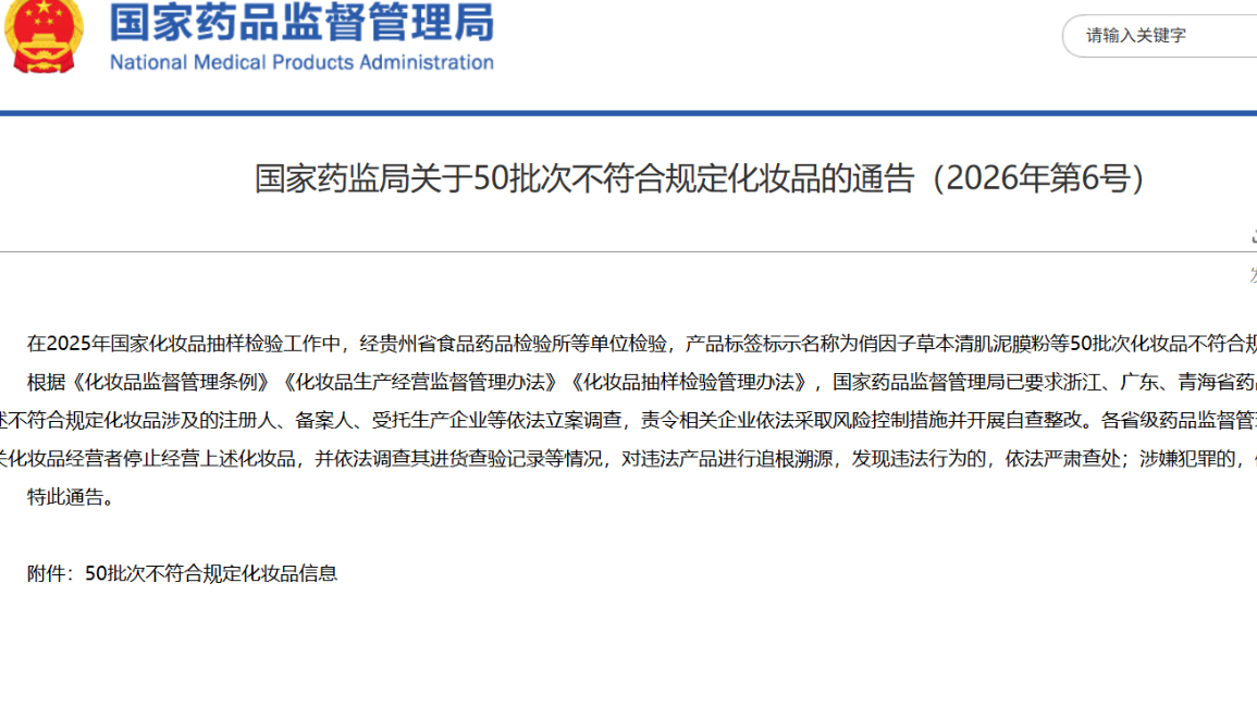 國(guó)家藥監(jiān)局關(guān)于50批次不符合規(guī)定化妝品的通告(2026年第6號(hào))