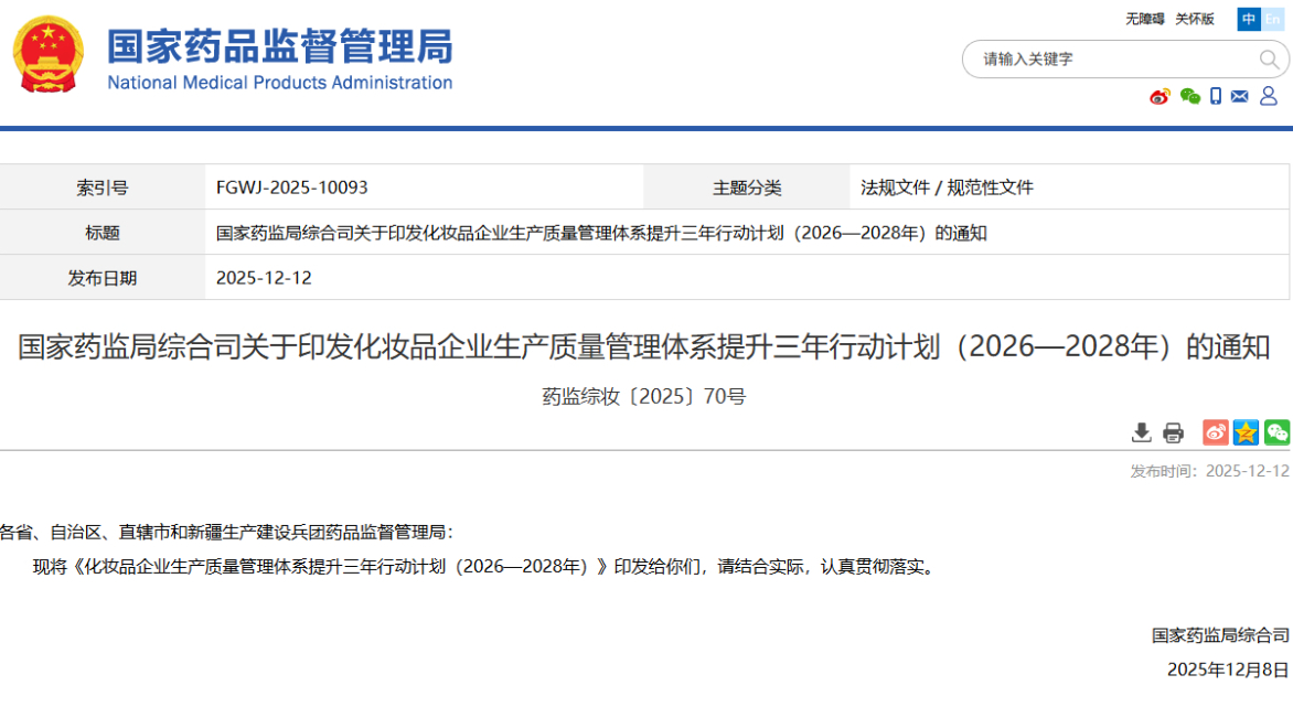 國家藥監(jiān)局綜合司關(guān)于印發(fā)化妝品企業(yè)生產(chǎn)質(zhì)量管理體系提升三年行動計(jì)劃(2026—2028年)的通知 藥監(jiān)綜妝〔2025〕70號