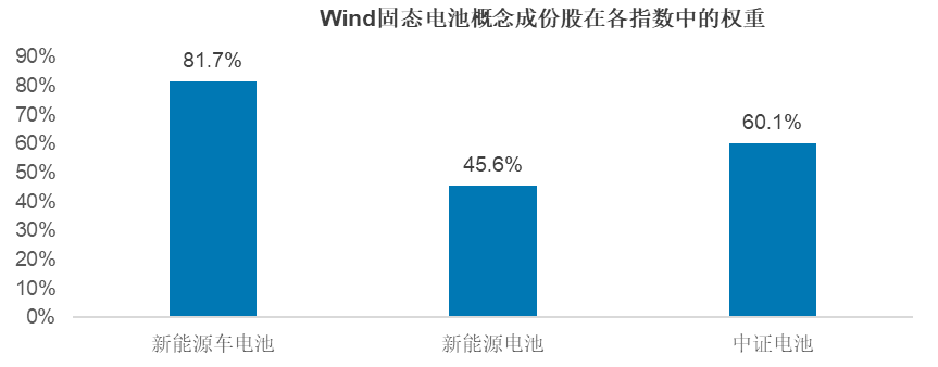 如果以Wind固态电池概念指数中的成份股为依据来计算固态电池含量,可以发现,三只指数中都有不小比例的固态电池概念股,其中固态电池含量最高的是新能源车电池指数,为81.7%,高于中证电池指数的60.1%和新能源电池指数的45.6%。