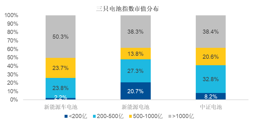 对比三只指数,新能源车电池指数主要聚焦核心龙头,成份股以宁德时代、比亚迪、三花智控等大市值公司为主。其中,市值1000亿元以上公司的权重占比高达50.3%,市值200亿元以下的公司权重占比仅2.2%。