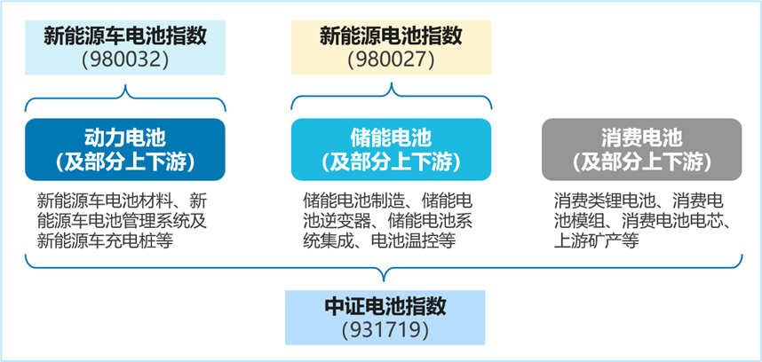 而中证电池指数则涵盖动力电池、储能电池、消费电池三类业务以及相关产业链上下游。